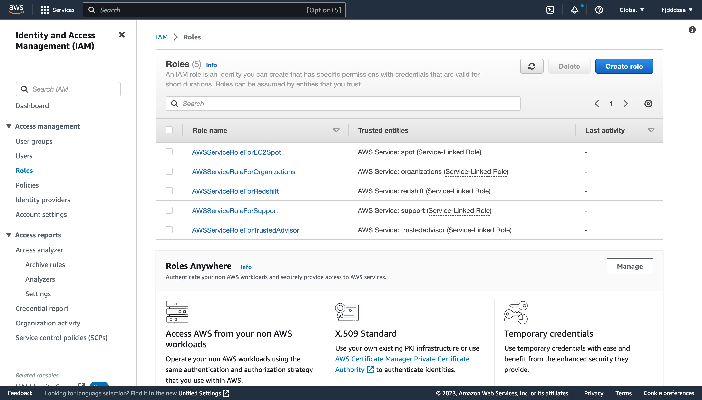 - Access the IAM service and select Roles from the menu. Click on the Create role button.