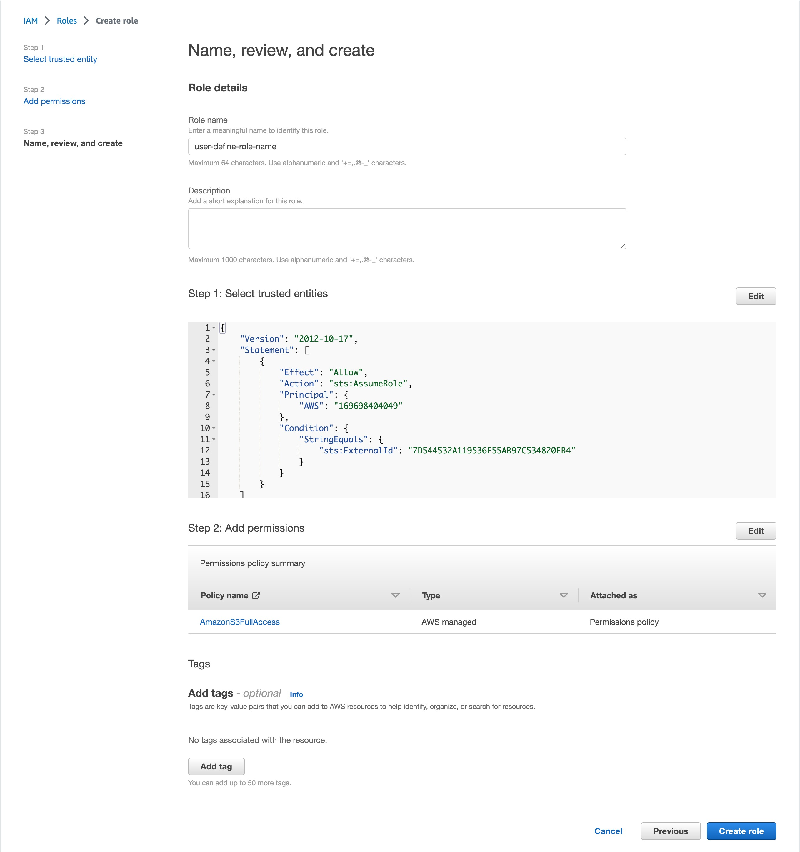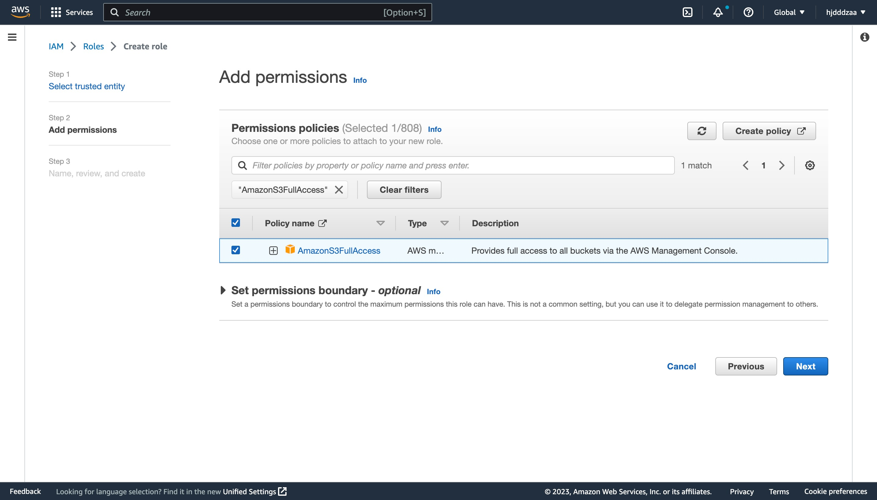- Select the permission policies you would like to attach to the role. Click on the Next button.