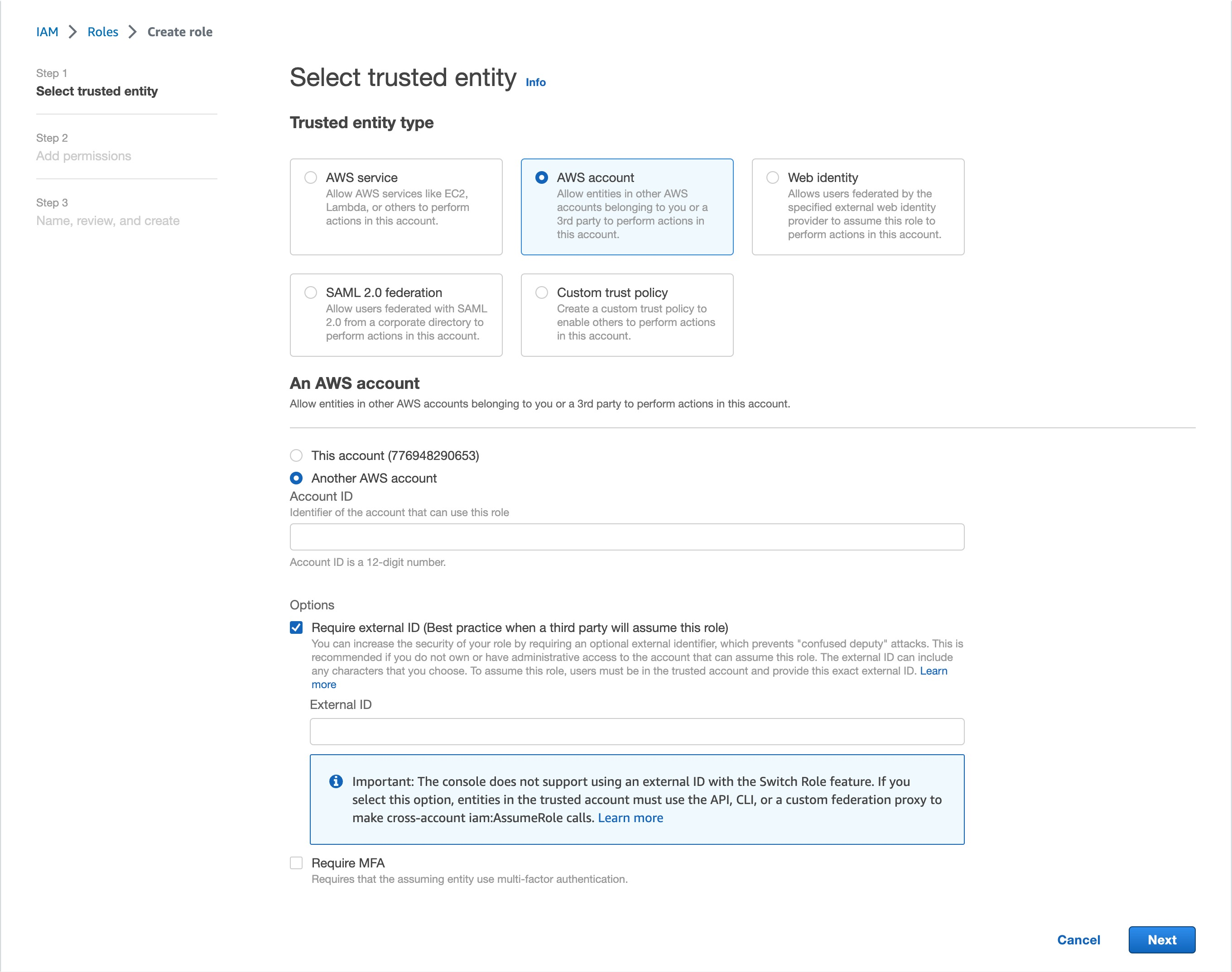 - Select AWS account in the Select trusted entity section. Select Another AWS account in the An AWS account section. Copy and paste SelectDBAWS account ID in the Account ID field. Then check Require external ID in options.Then copy and paste External ID in the External ID field. Click on the Next button.