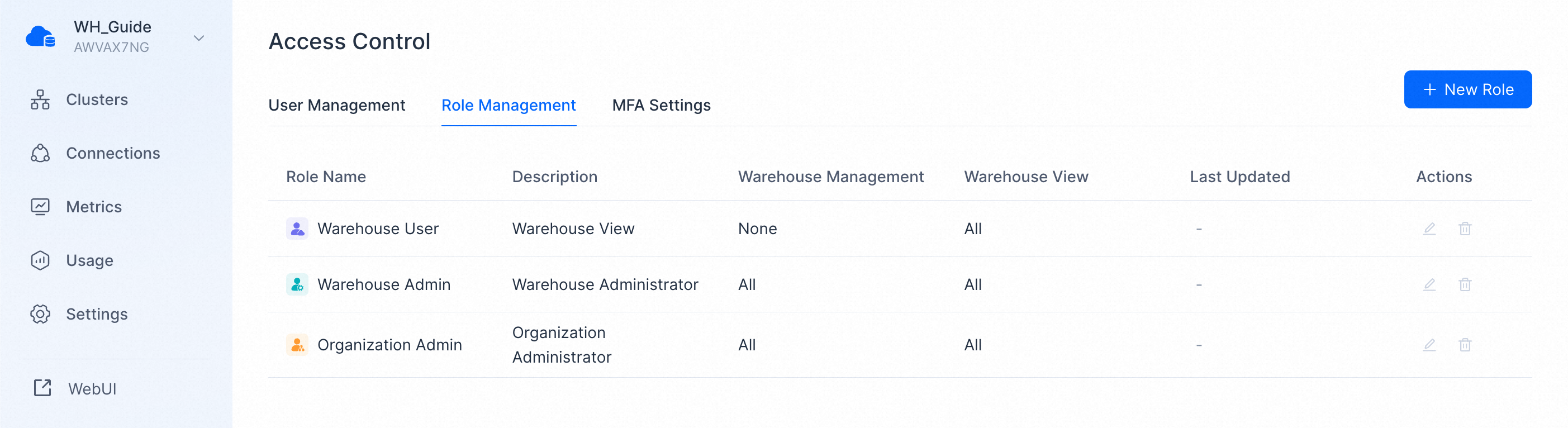 Organization Admin | Yes | Yes | Yes | All warehouse: Create / Edit / View / Query / Monitor |