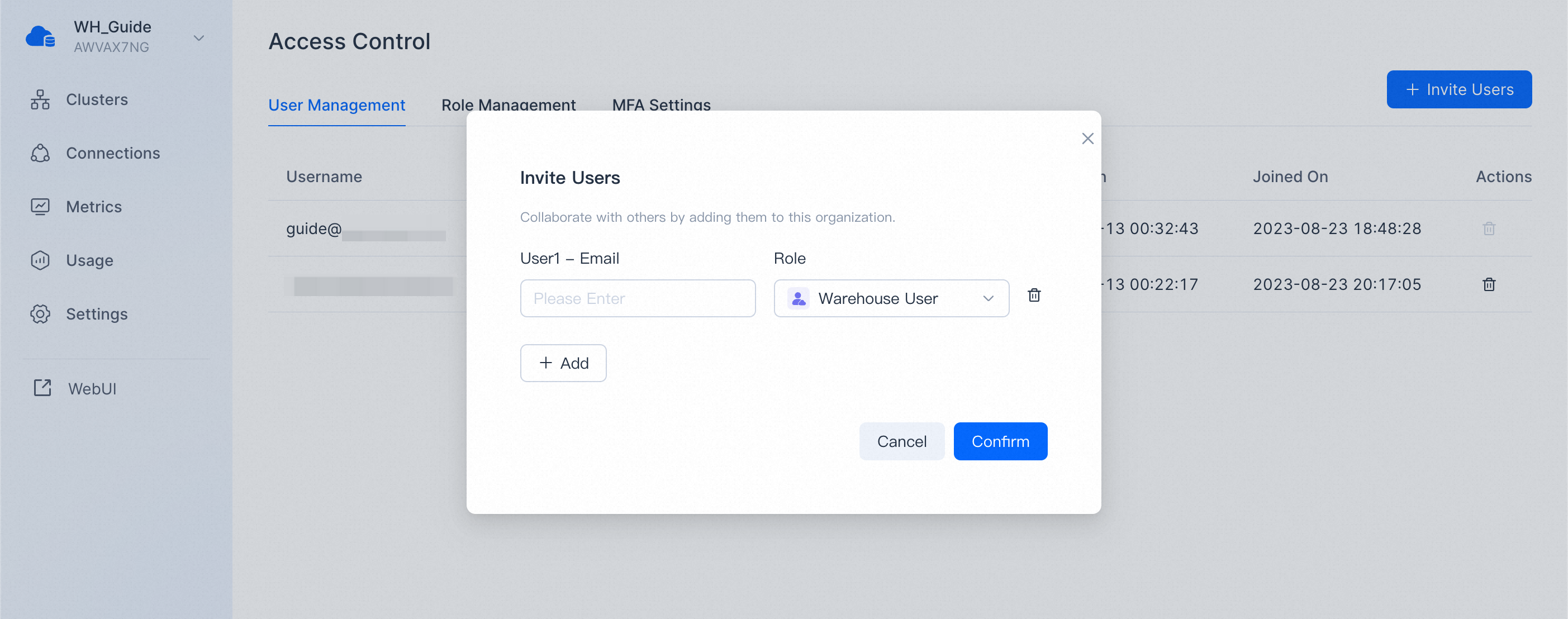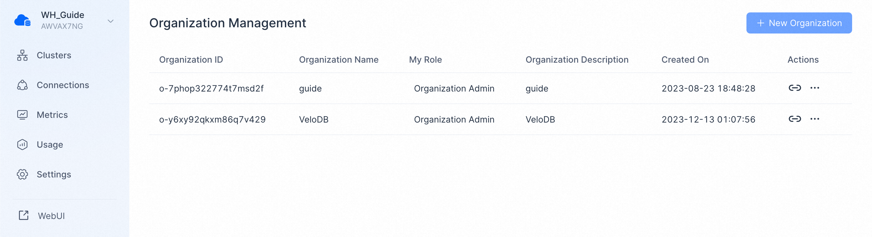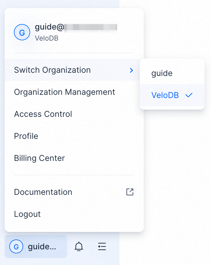 Tip VeloDB Cloud includes two independent account systems: One is used for logging into the console, as described in this topic. The other one is used to connect to the warehouse, which is described in the Connections topic.