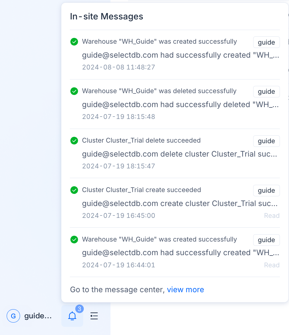 You can click view more to go to the message center and view the in-site messages in list form. You can filter by time range, filter unread/read messages with one click, view messages in pages, mark all messages as read with one click, mark checked messages as read with one click, etc.