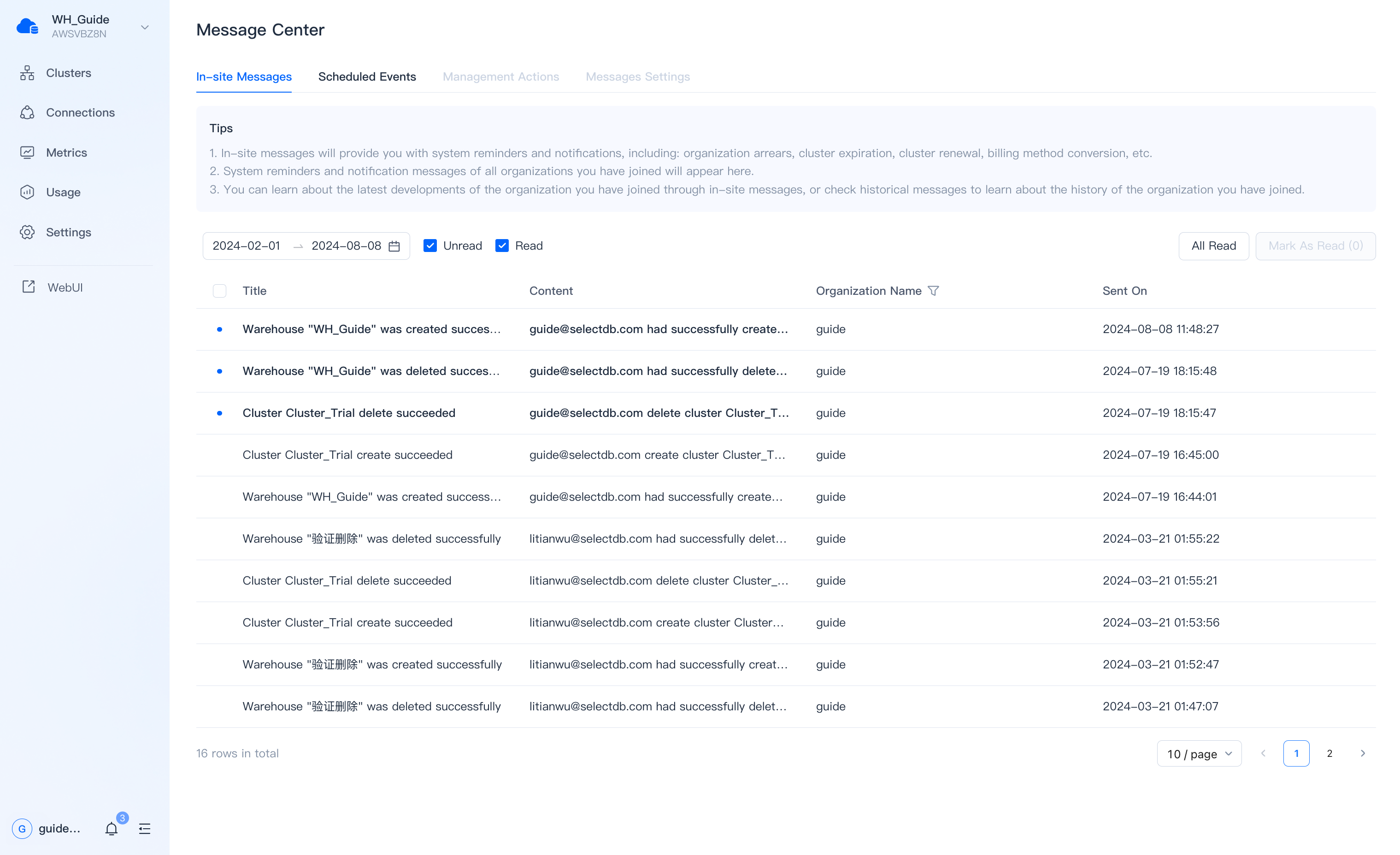 Users, organizations, authorized warehouses, cluster operations, and alarms in the platform will be notified to remind users when they are triggered.