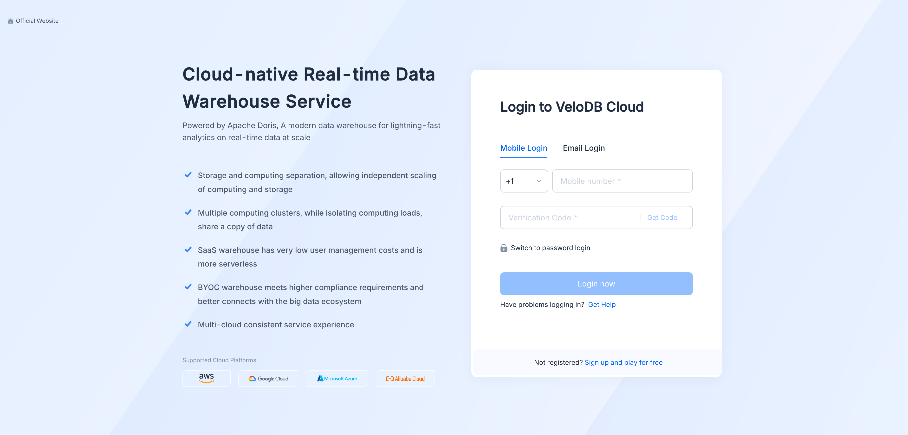 Click https://www.velodb.cloud/ to enter the VeloDB Cloud registration and trial page and fill in the relevant information to complete the registration.