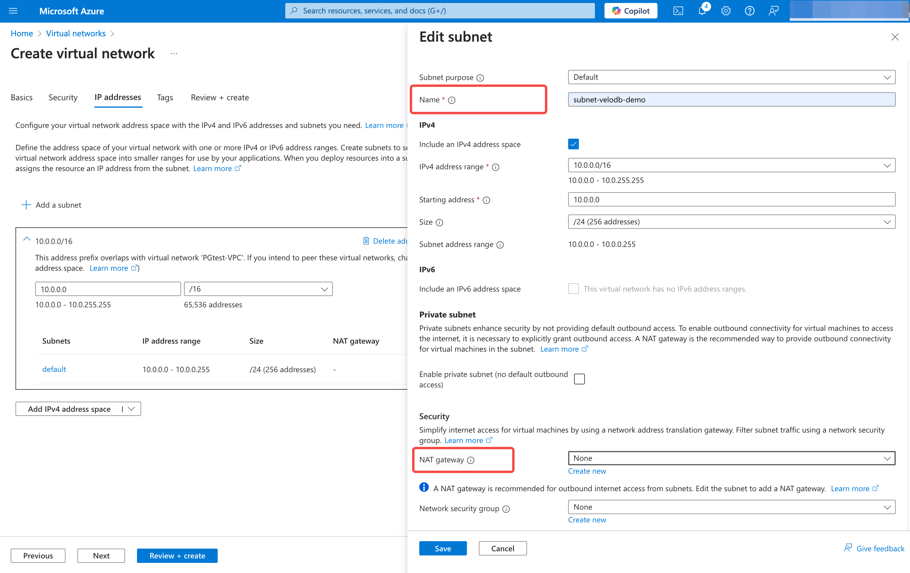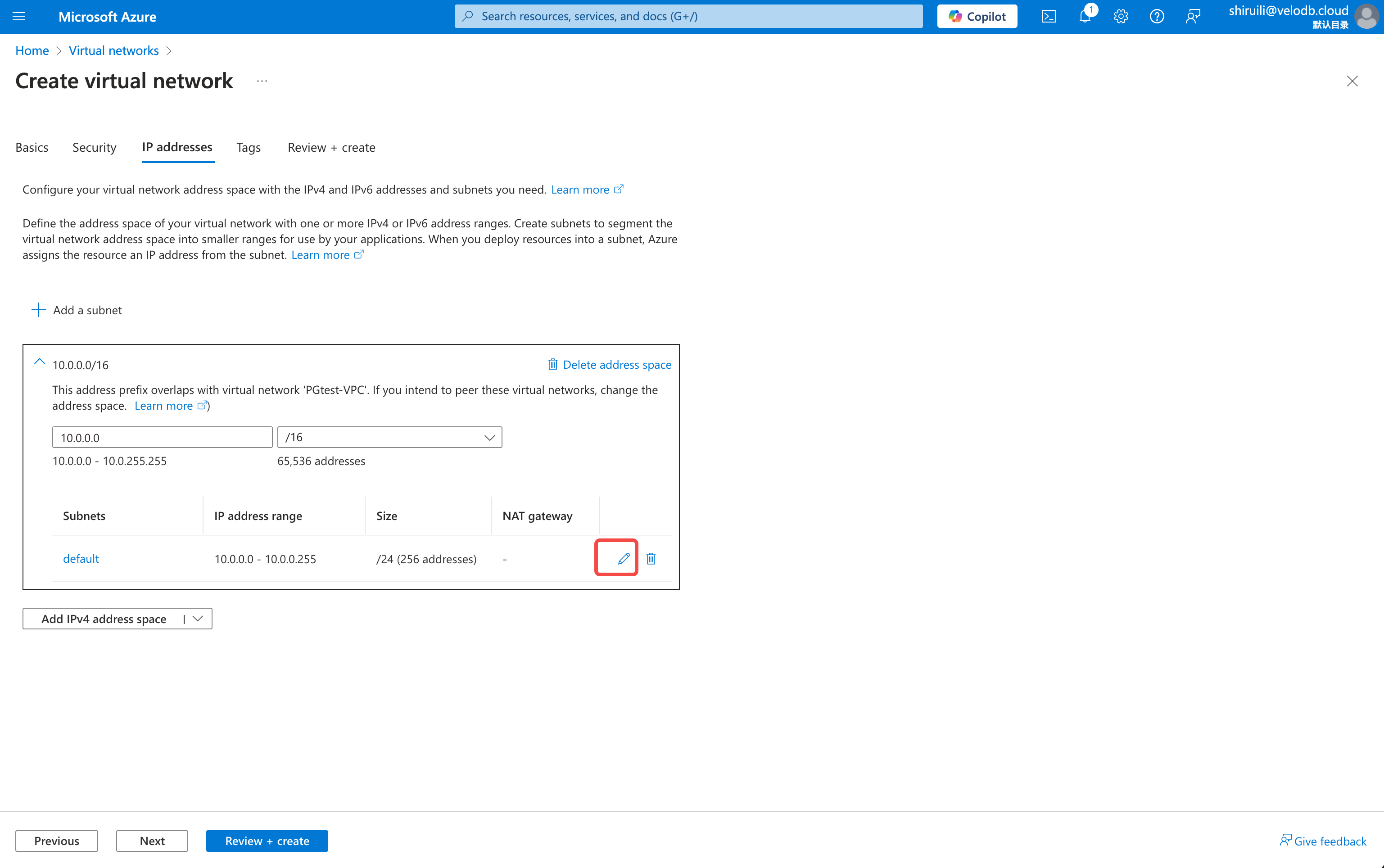 Click + Add a subnet. Click Edit.