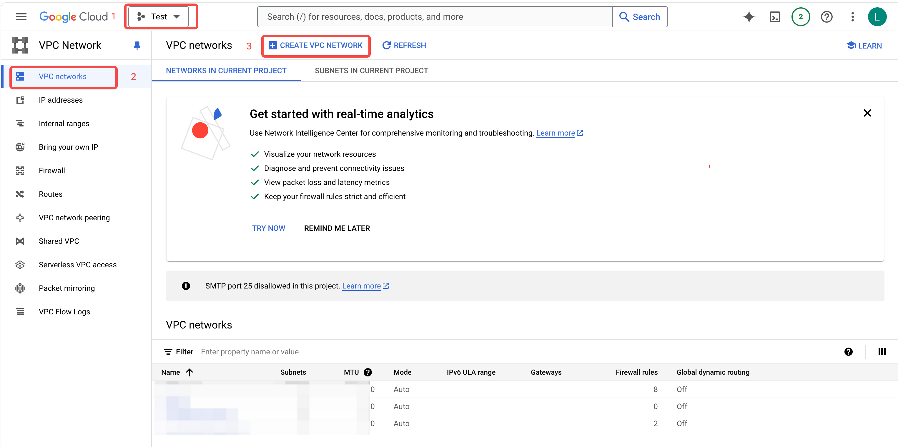 Click VPC networks > CREATE VPC NETWORK to enter the VPC creation page.