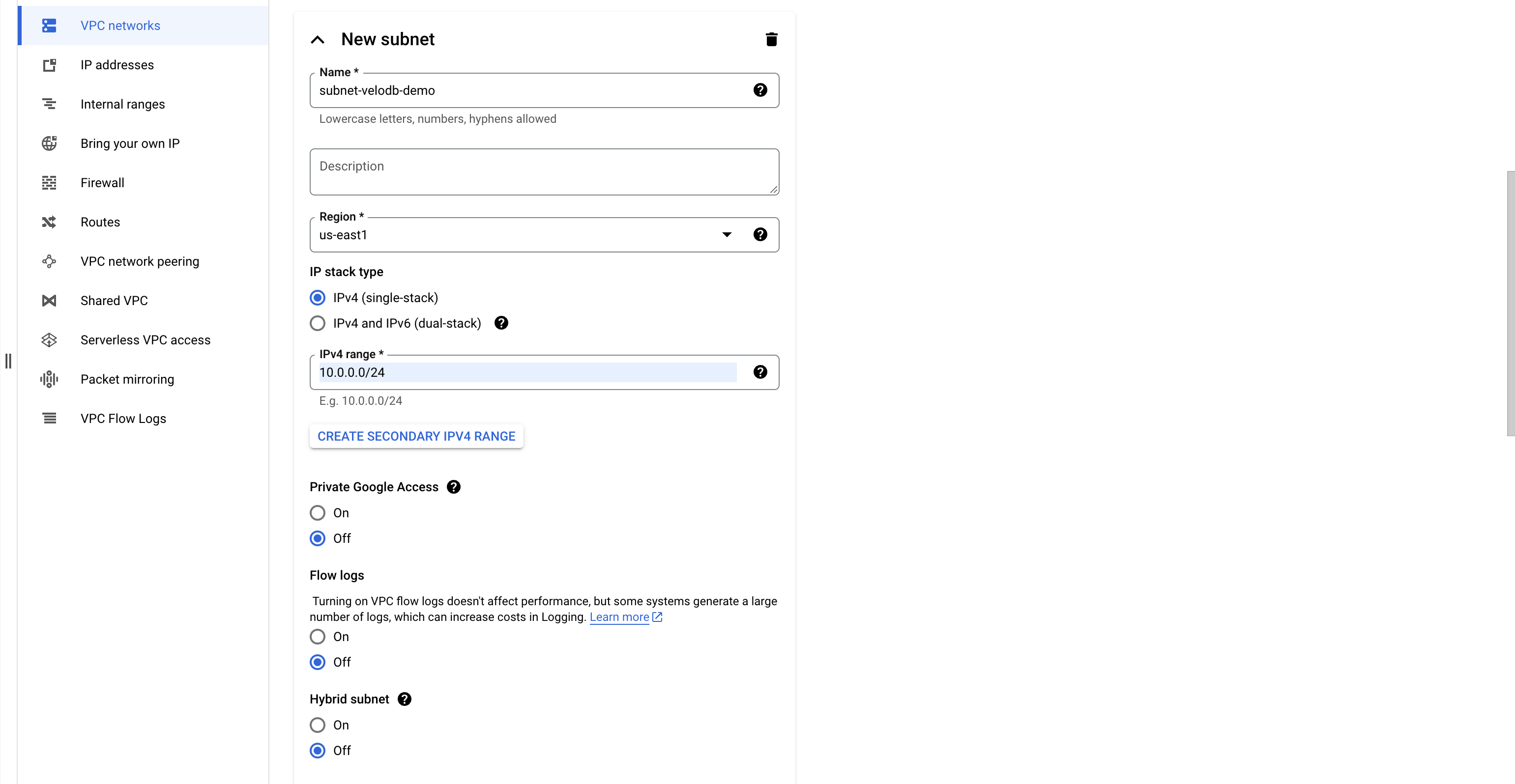 Select off for Private Google Access, Flow logs, Hybrid subnet.