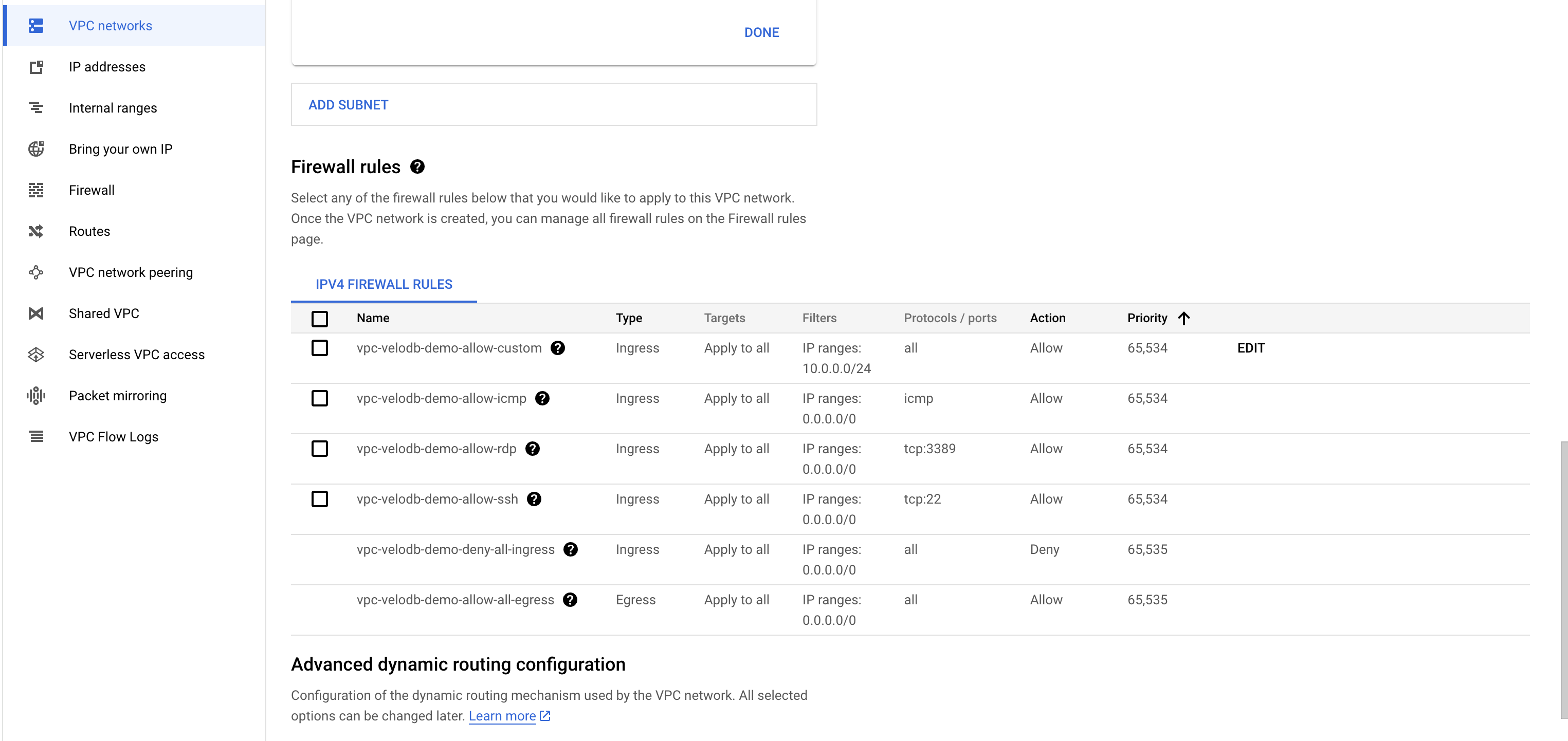 - Purpose: Bound to the endpoint and all VM instances created by VeloDB, and restrict inbound and outbound traffic for specific ports and sources through firewall rules