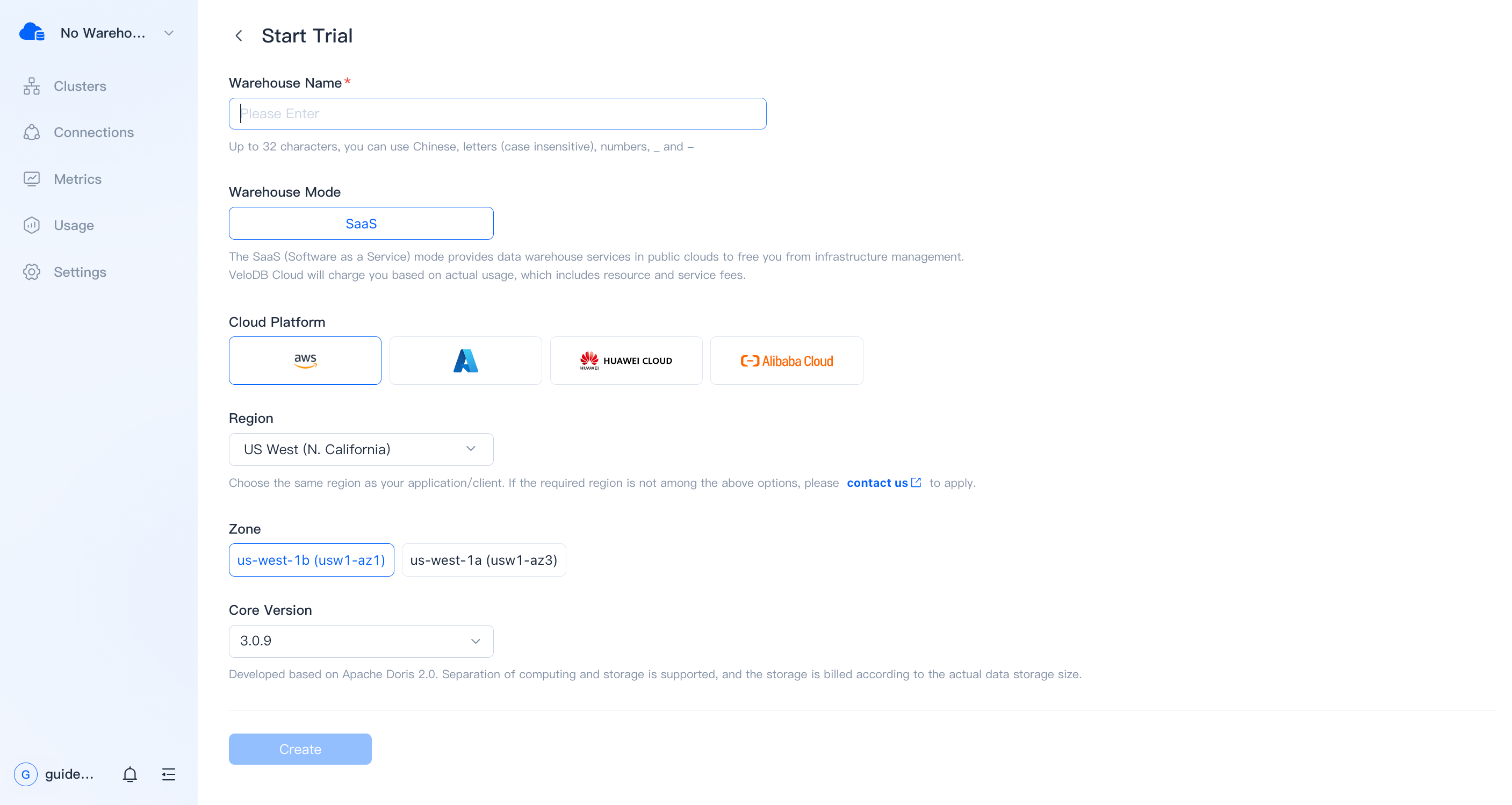 Cloud Platform | Select the cloud platform where you want to create the data warehouse. Currently, VeloDB Cloud supports AWS, Azure, Alibaba Cloud, HUAWEI CLOUD, and will soon support GCP. |