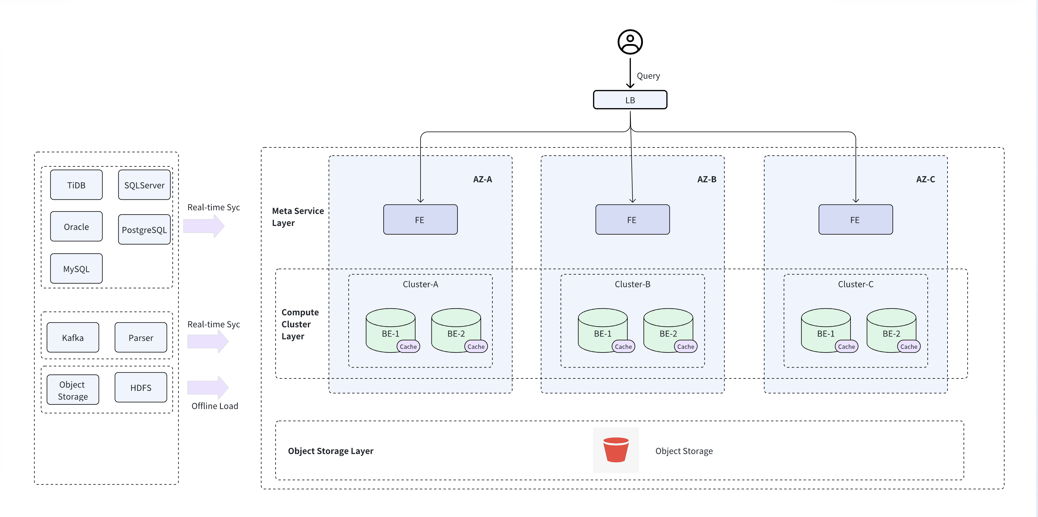 - If a certain availability zone is unavailable, you hope that the query service is fully available without interruption time: you can deploy a computing cluster in 2 or 3 availability zones to form 2 computing clusters, and both computing clusters can read and write.