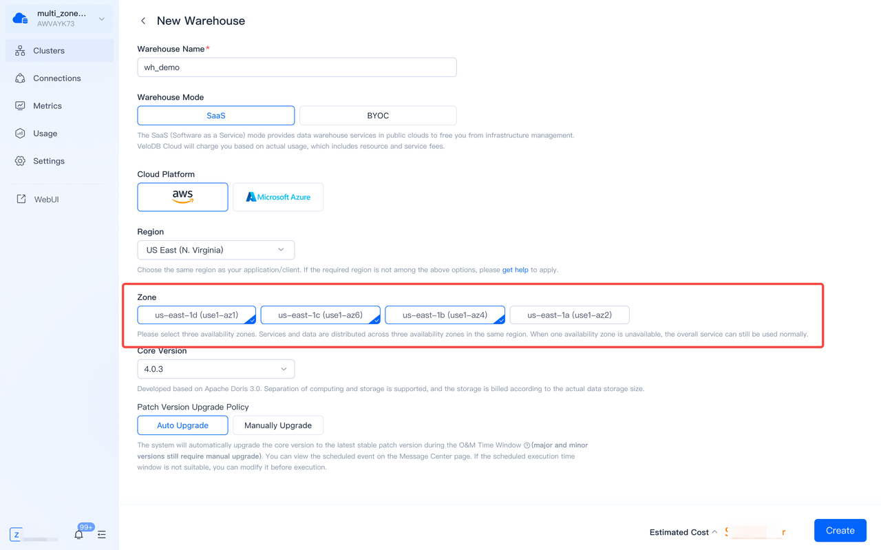 When creating a warehouse, you need to select three of the candidate availability zones when selecting the availability zone. The system will deploy the warehouse in three availability zones to ensure that the service is not interrupted when any availability zone fails.