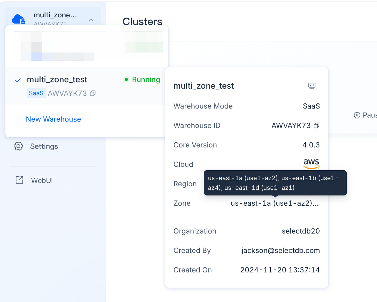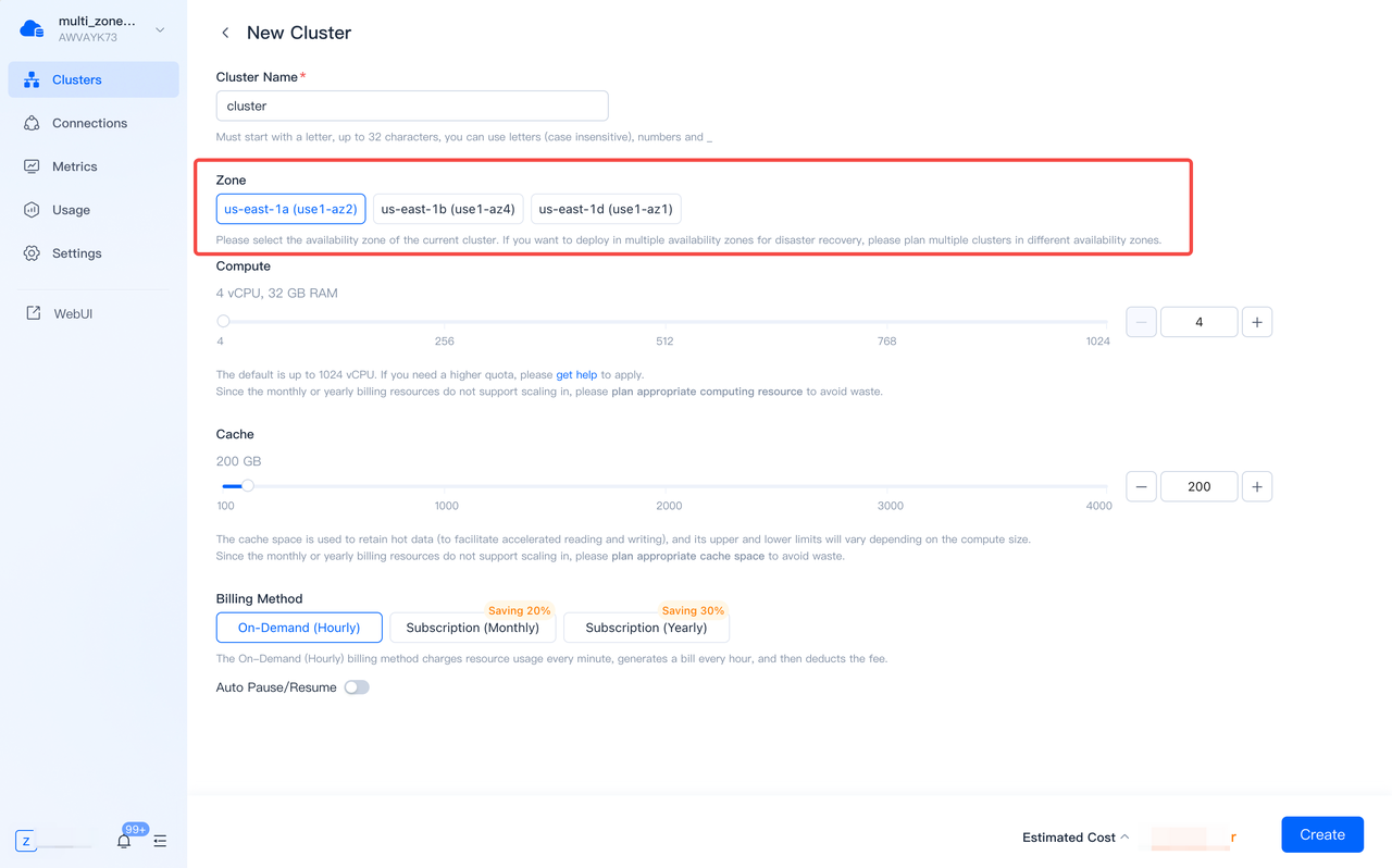 When creating a single cluster, select the availability zone, and you can only select one of the three availability zones of the warehouse. When creating multiple clusters, each cluster can select a different availability zone.