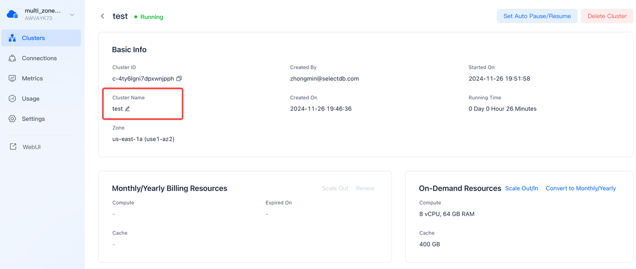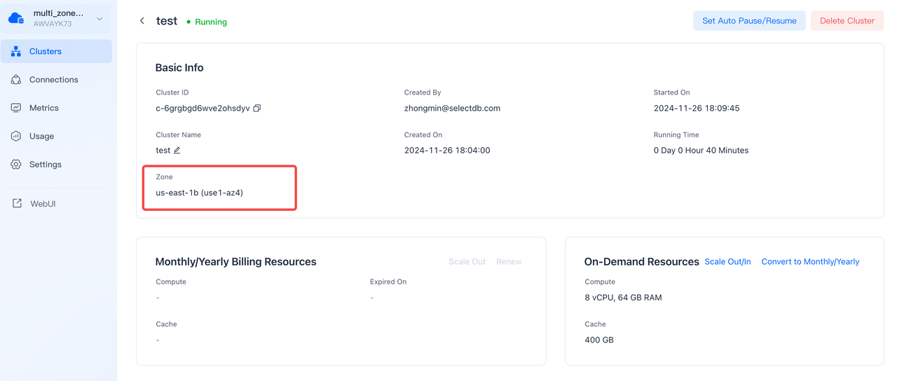 After the cluster is successfully created, you can view the availability zone where the cluster is located on the cluster details page.