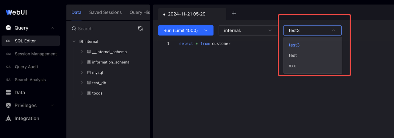 When executing SQL commands, you can select Switch Cluster in the upper right corner