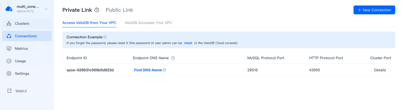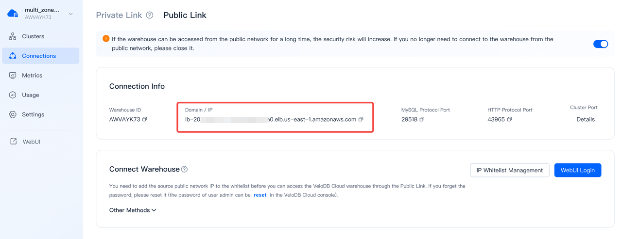 Use public network connection to access VeloDB Cloud When creating a warehouse, you can directly use the provided domain name to access it, and the system will automatically route to the FE nodes in the three availability zones.