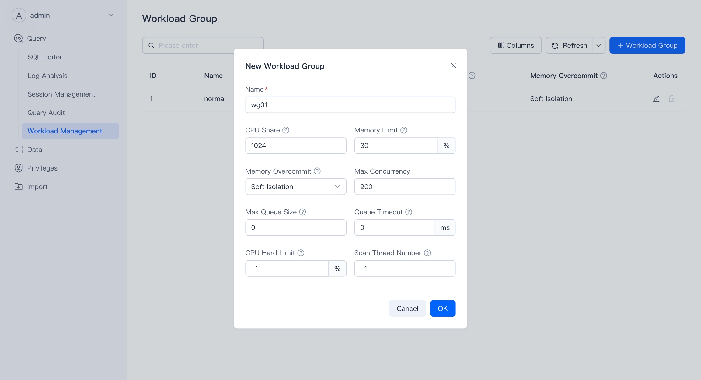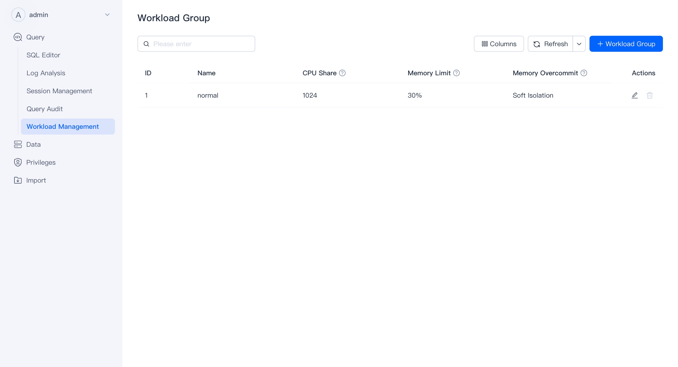 - Workload Management : Supports quick creation, editing, and viewing of Workload Groups.