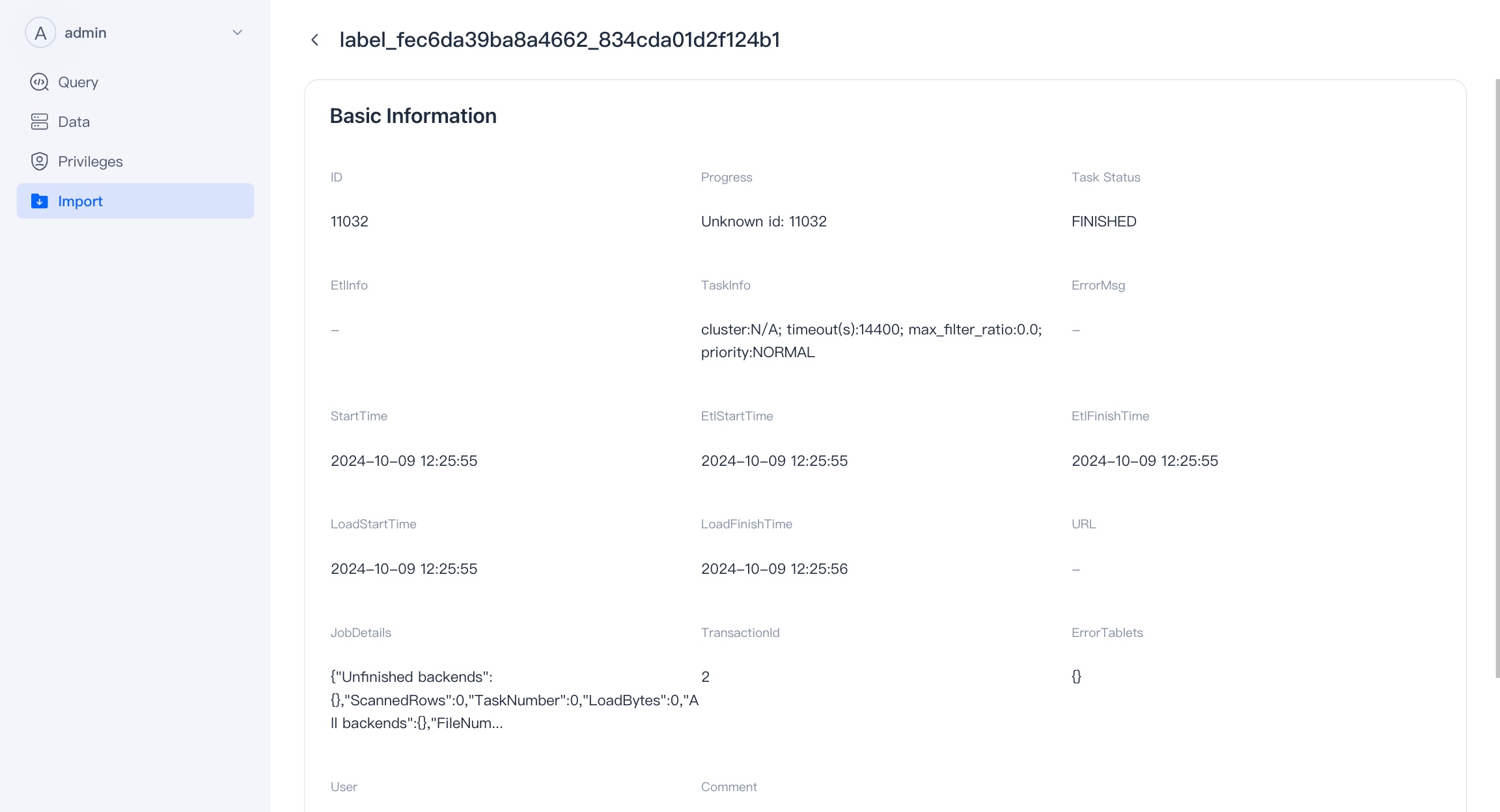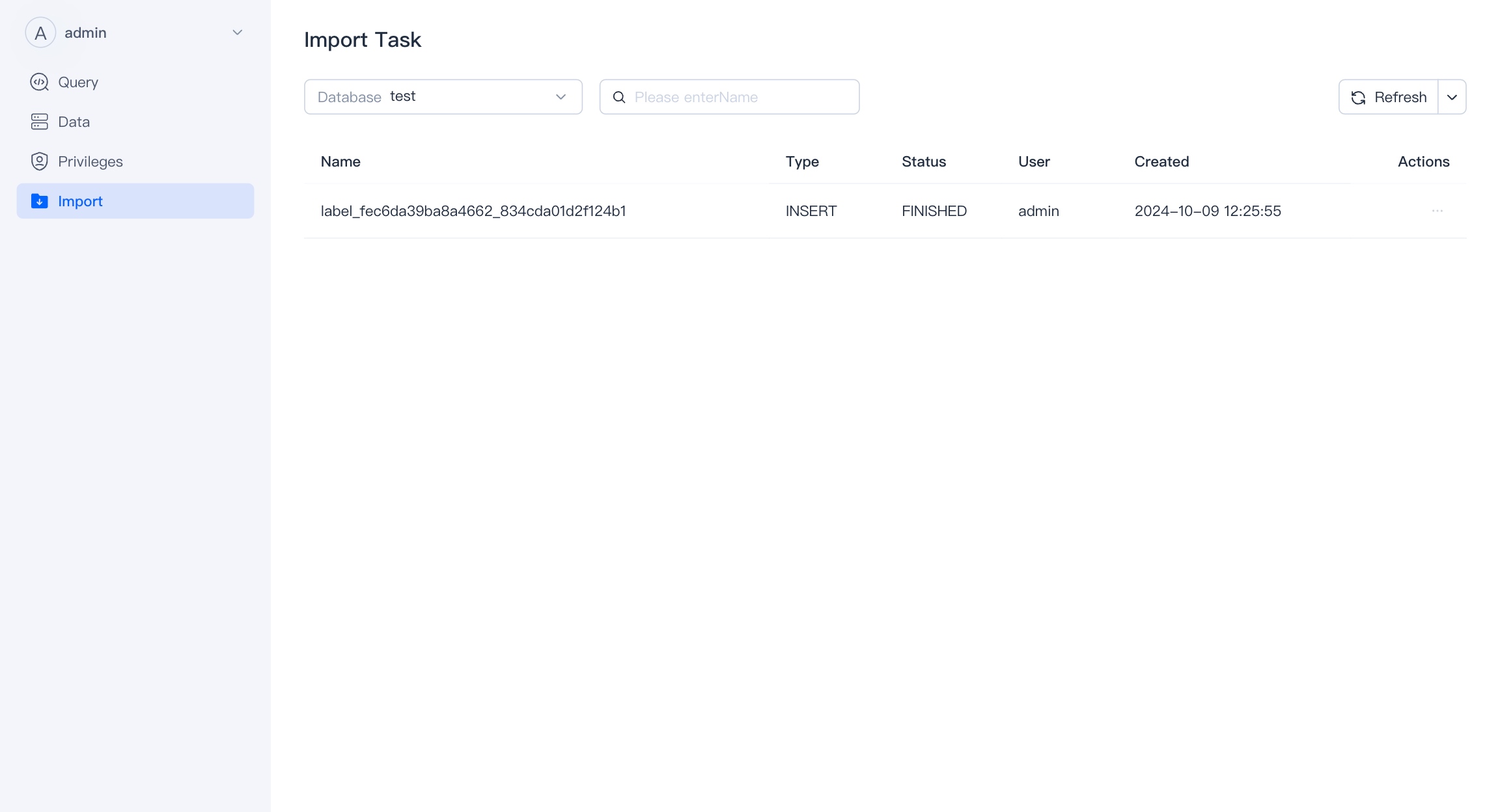 You can view the list of import tasks for the corresponding database in the import module, and perform related operations on these import tasks.
