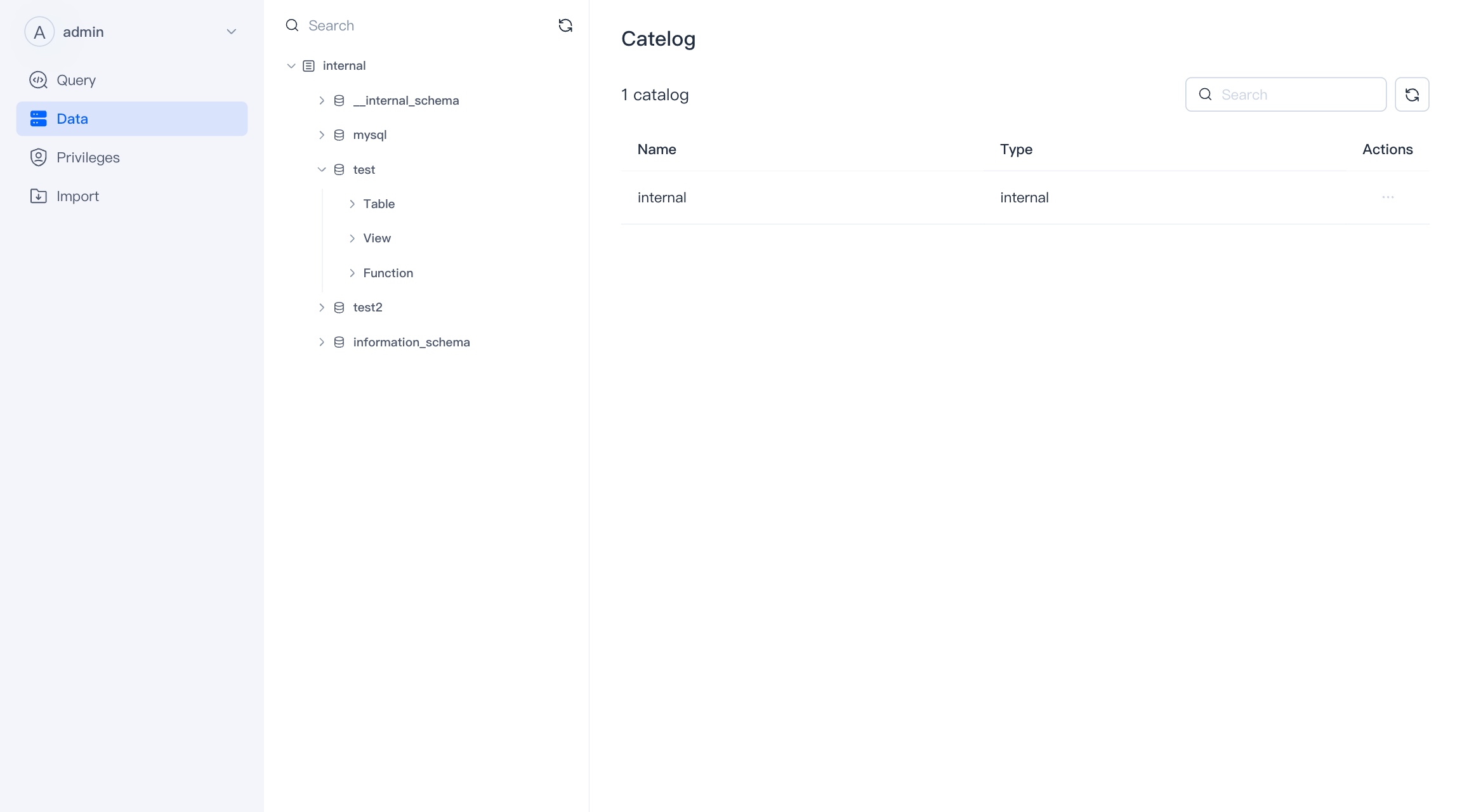 The data module is displayed according to the organizational form of the data in the database, and is divided into Catalog -Database -Table /View .