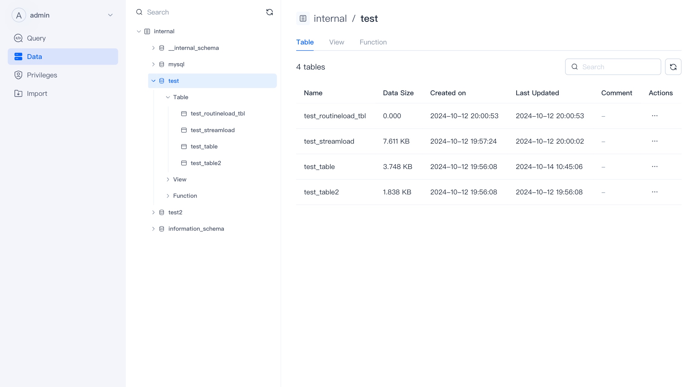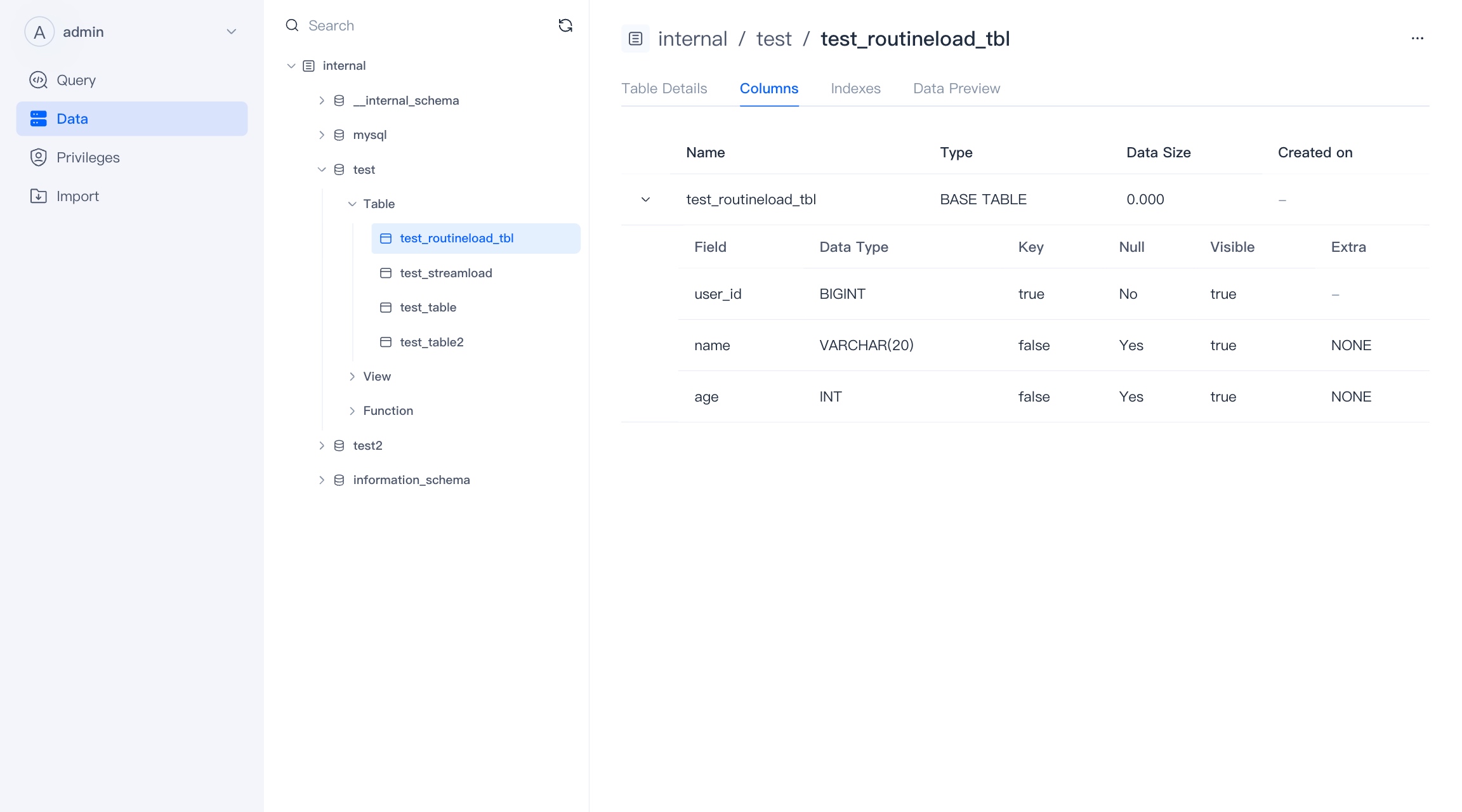 When a database is selected, you can see the tables under the database, as well as the size of the table, creation and modification time.