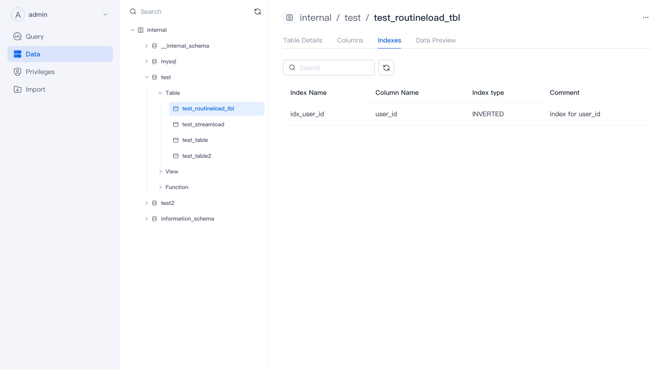 Here is the index information in the table. There are many index-like acceleration methods in VeloDB. Here, partitions, primary keys, and rollups are not treated as indexes for the time being, and only Zonemap, Bloomfilter, Bitmap/Inverted Index are displayed.