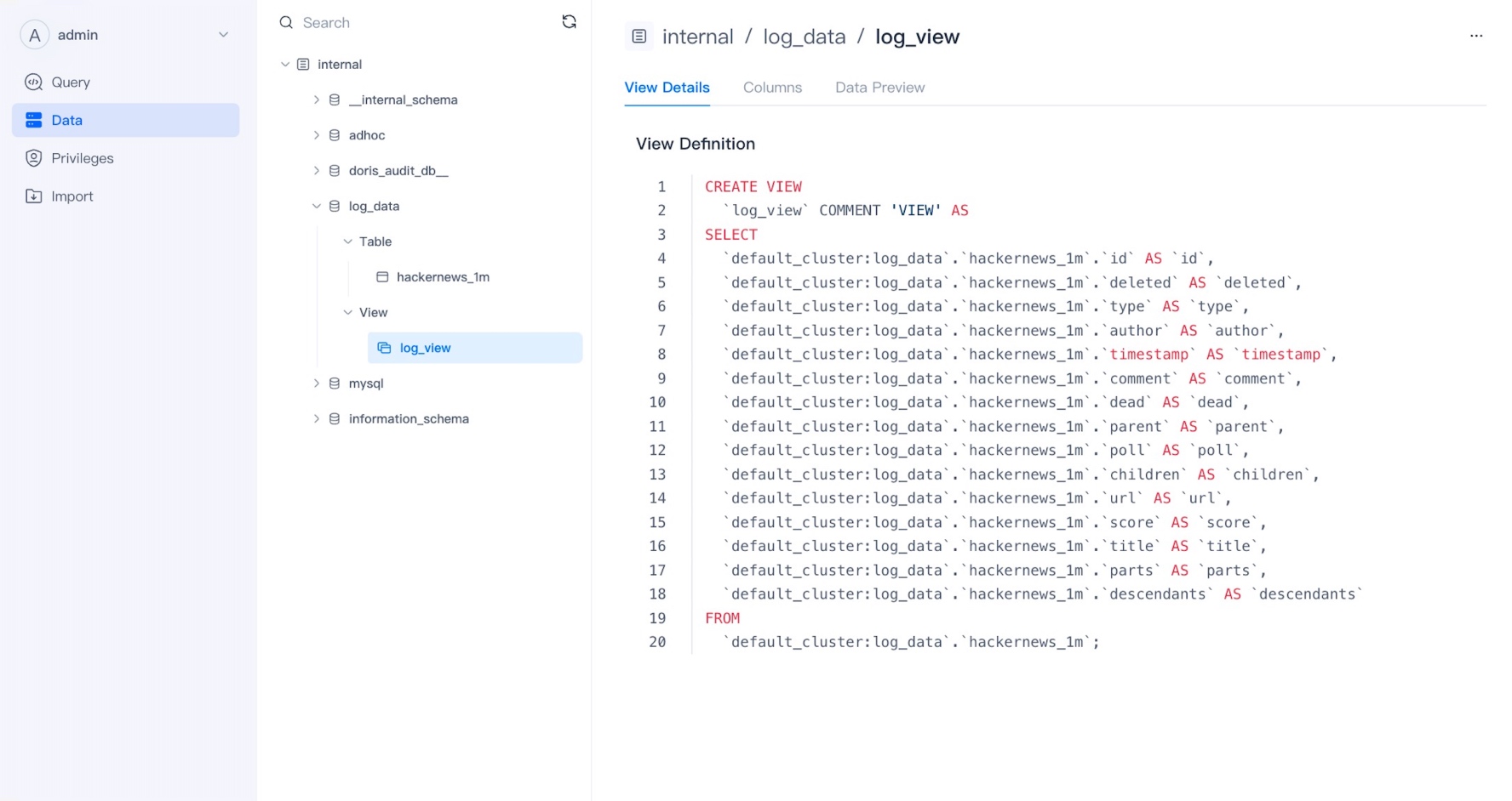 The view page is roughly similar to the table page, and the attributes that the view does not have (such as index and details) will not be displayed.