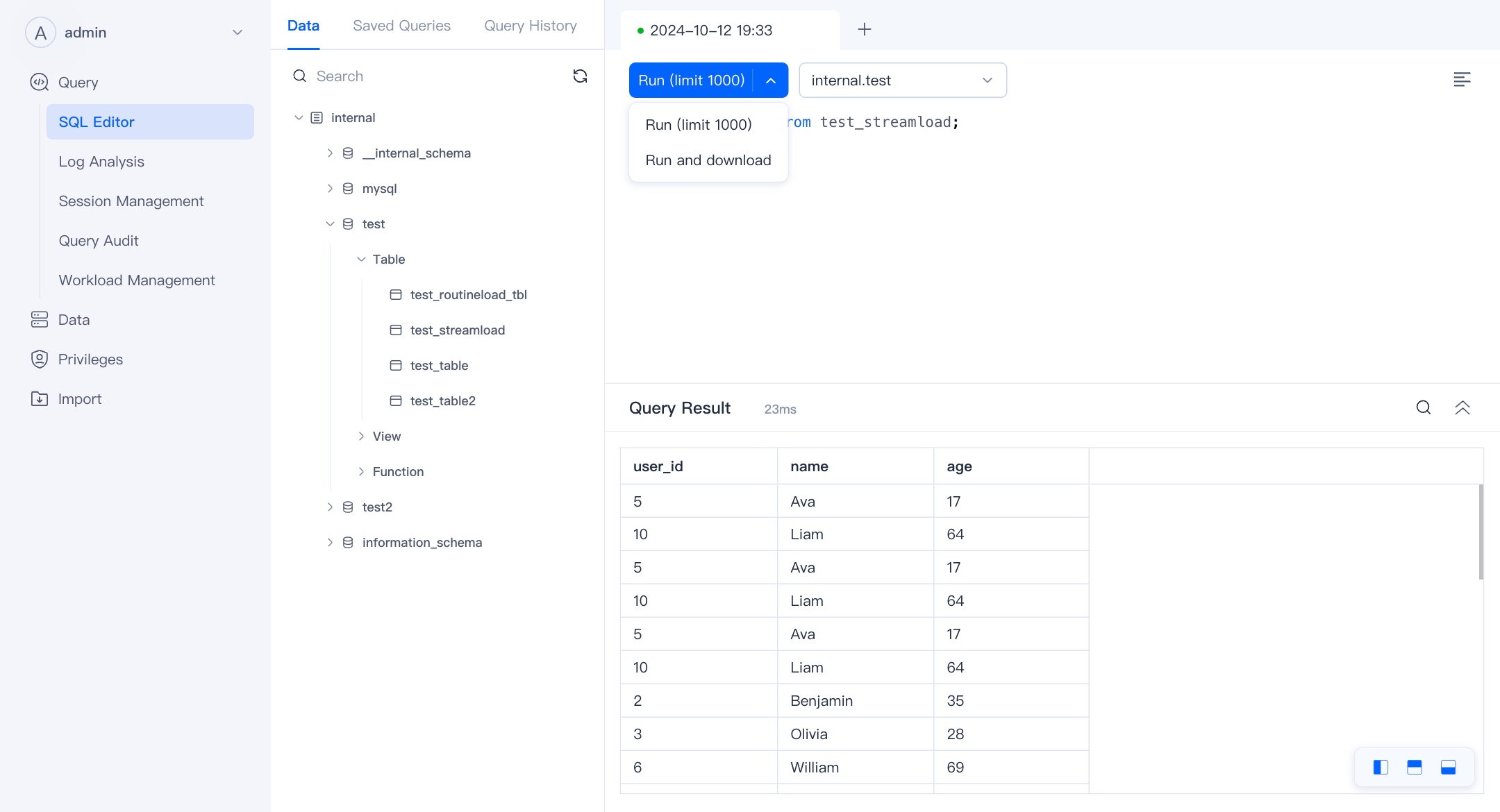 At the same time, you can click the drop-down button Run (LIMIT 1000) and switch to Run and Download to download your query results.