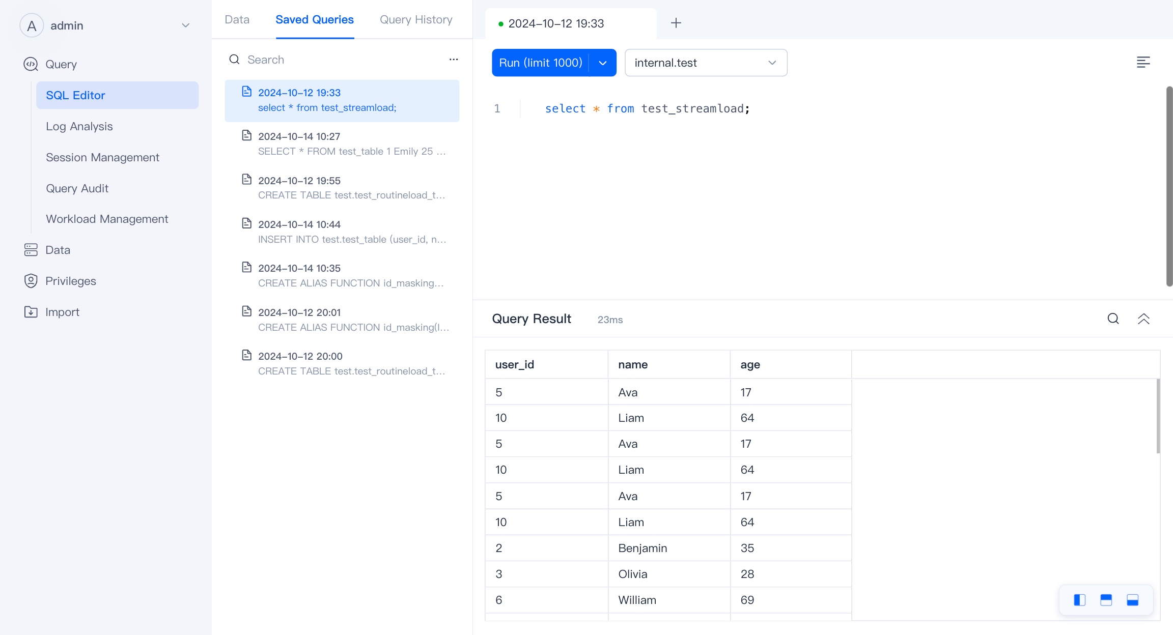 The tabs you create in the SQL Editor and the queries you initiate will be automatically saved. You can double-click on the tab to modify the title of the saved SQL. In Saved Queries, you can view the saved queries and reopen them.