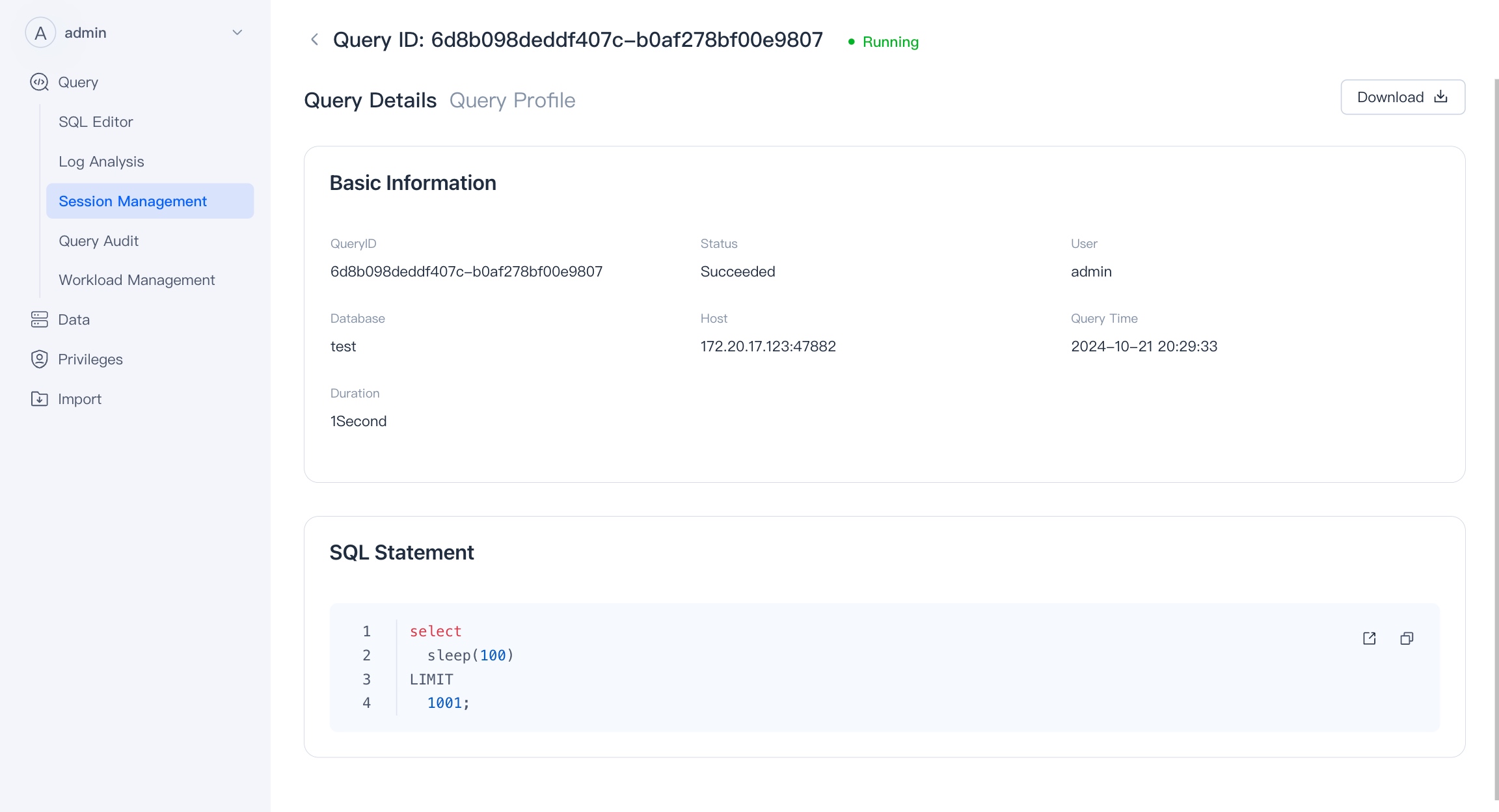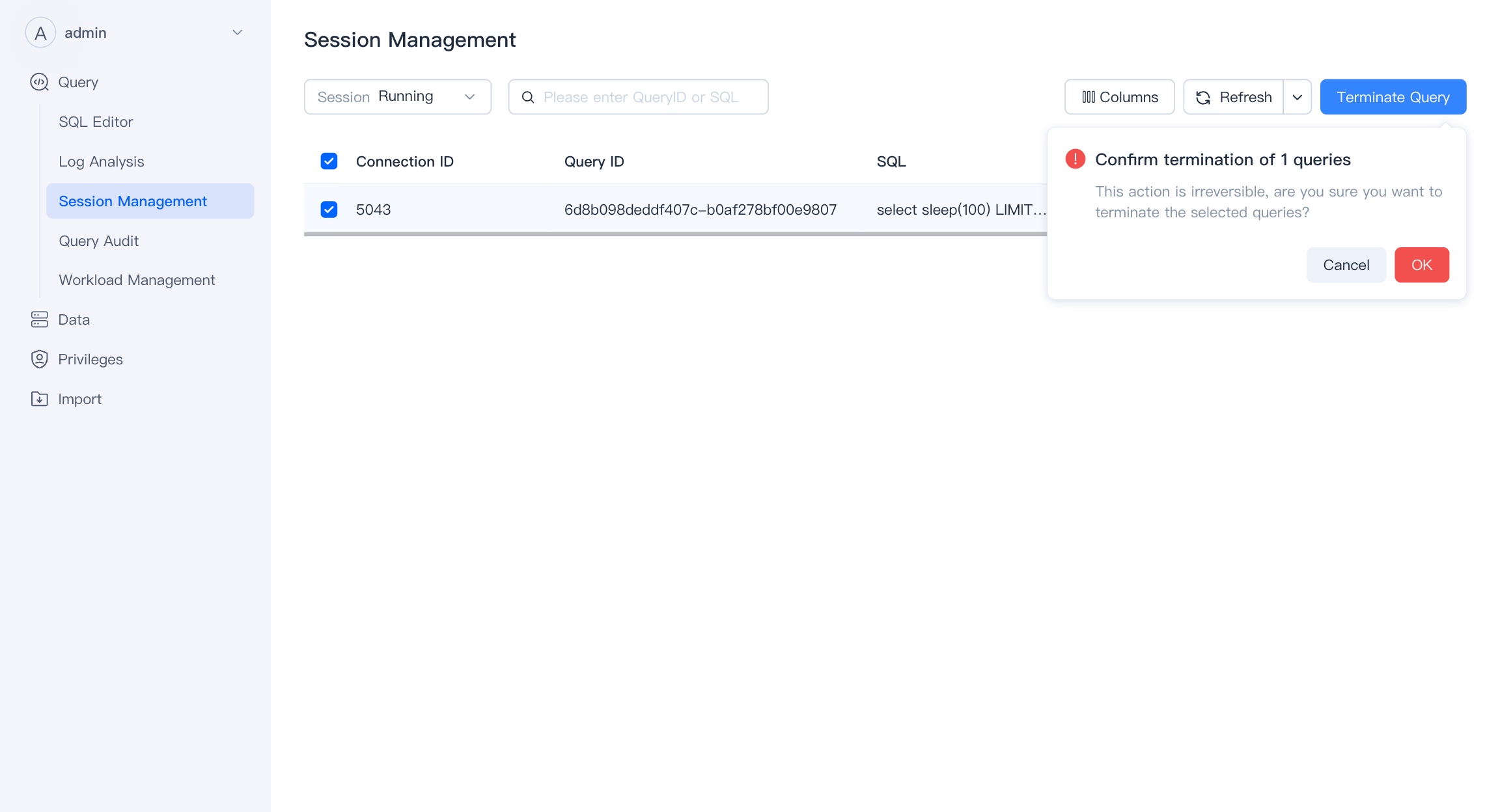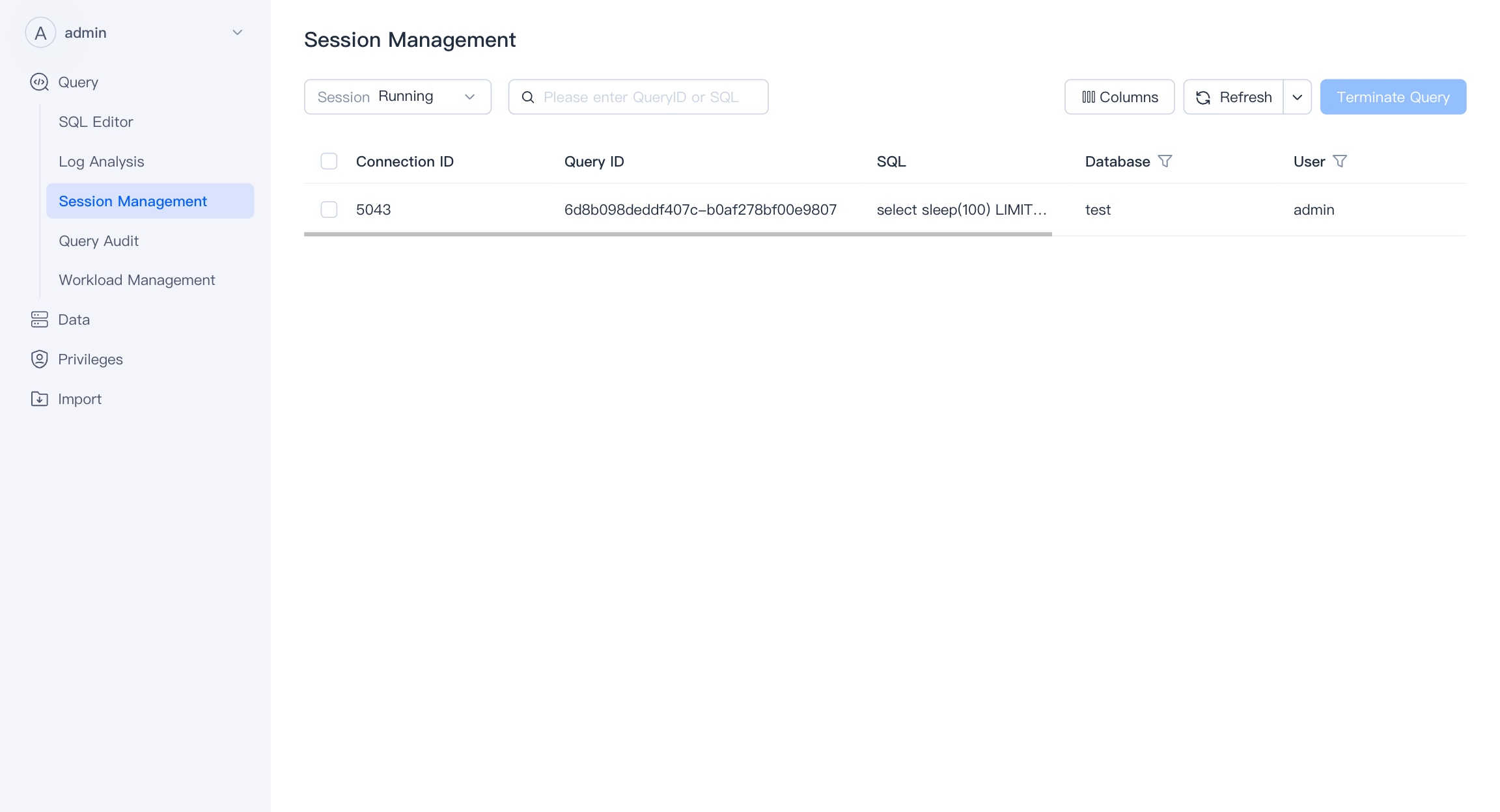 - Session Management : Manages running SQL queries, allowing users to view and kill SQL queries;