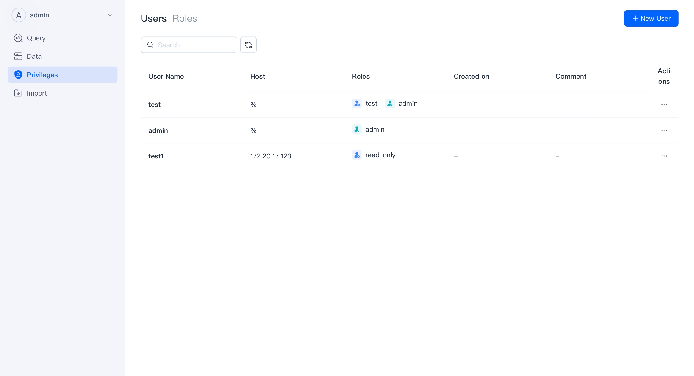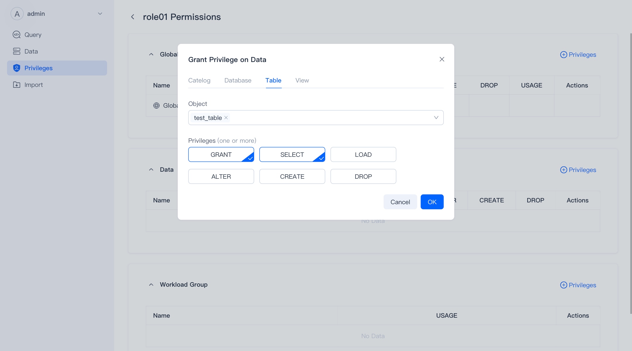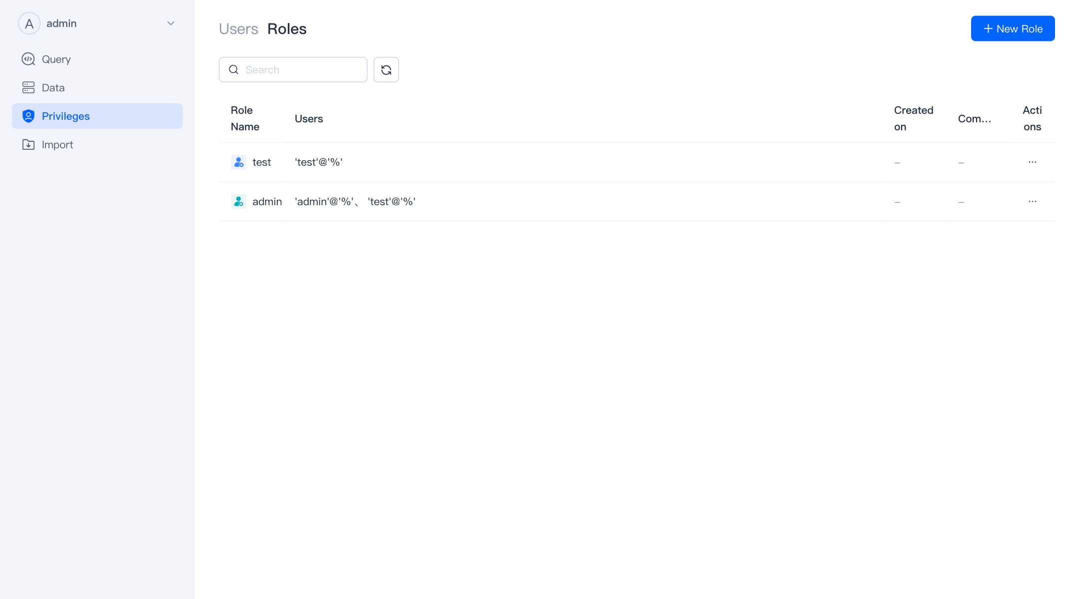 Here you can manage the roles in VeloDB, and also perform authorized operations on the roles.