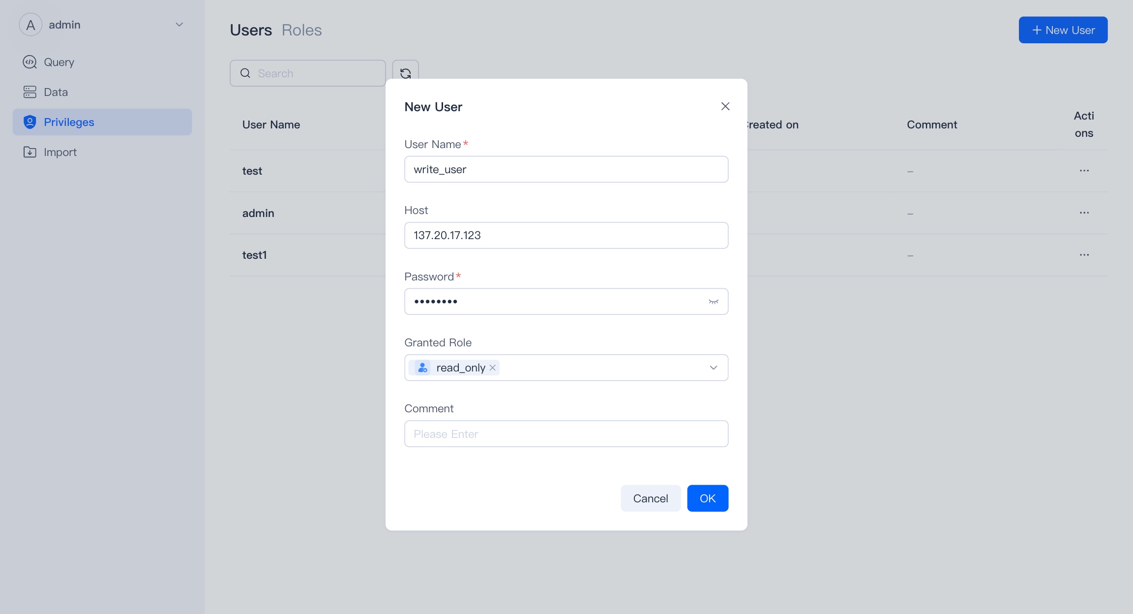 You can create a new user on this page, except for the username, other content is optional. However, we strongly recommend that you add passwords for users and restrict access to hosts for enhanced security.