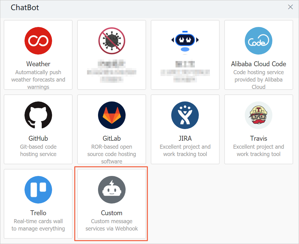- ChatBotダイアログボックスでAdd Robotセクションの**+**アイコンをクリック。その後、Customをクリック。