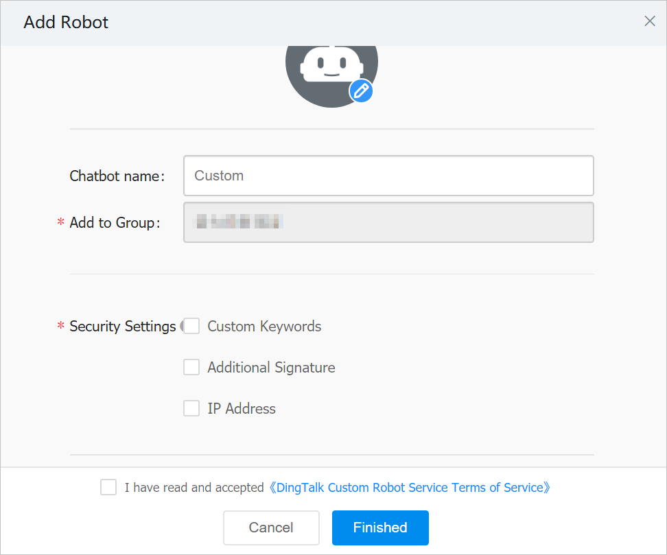 - 利用規約を読み、I have read and accepted DingTalk Custom Robot Service Terms of Serviceを選択。