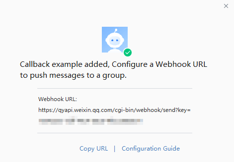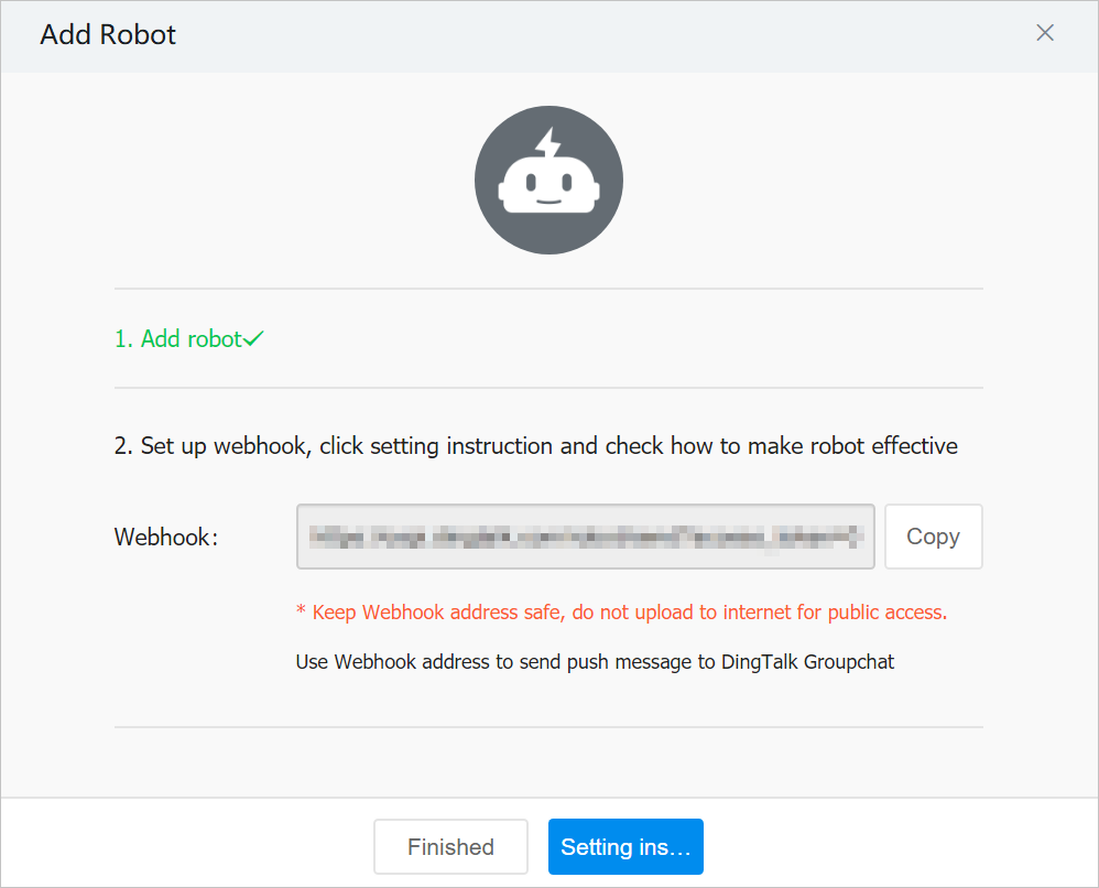 - Add Robotダイアログボックスで、DingTalkチャットボットのwebhookアドレスをコピーし、Finishedをクリック。