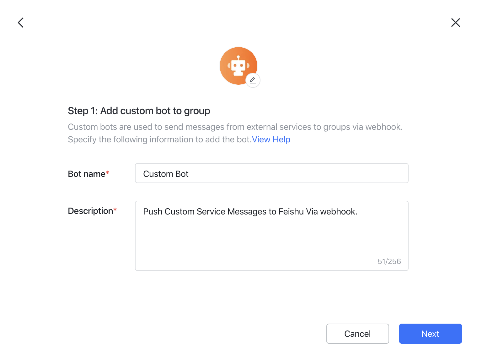 外部システムからグループチャットにメッセージを即座にプッシュするカスタムボットを作成するには、webhookを使用してグループチャットと外部システムを接続する必要があります。対象のグループに入り、Settings > BOTs > Add Botをクリック。Custom Botを選択。ボットに適切な名前と説明を入力し、Nextをクリック。