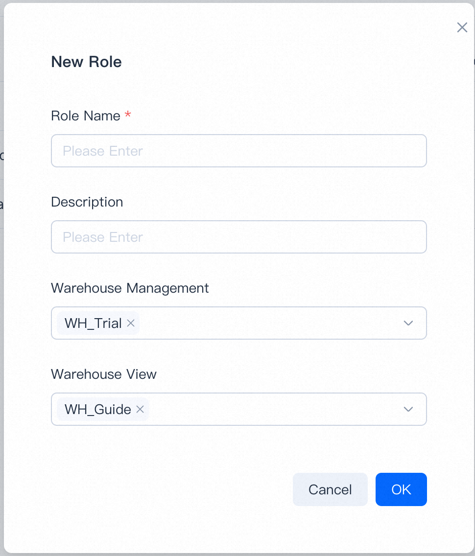 | Organization Admin | Yes | Yes | Yes | All warehouse: Create / Edit / View / Query / Monitor |